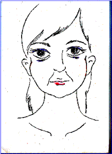 2 こめかみが横にせり出し、頬骨が突き出た、顔が横に広くなった。