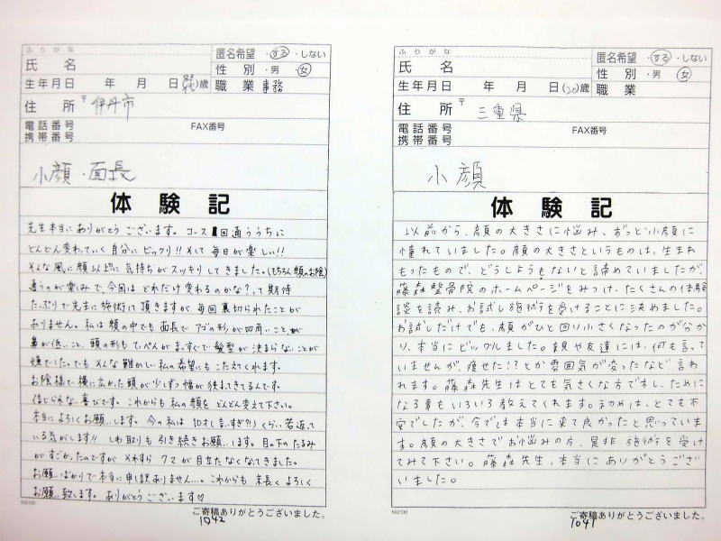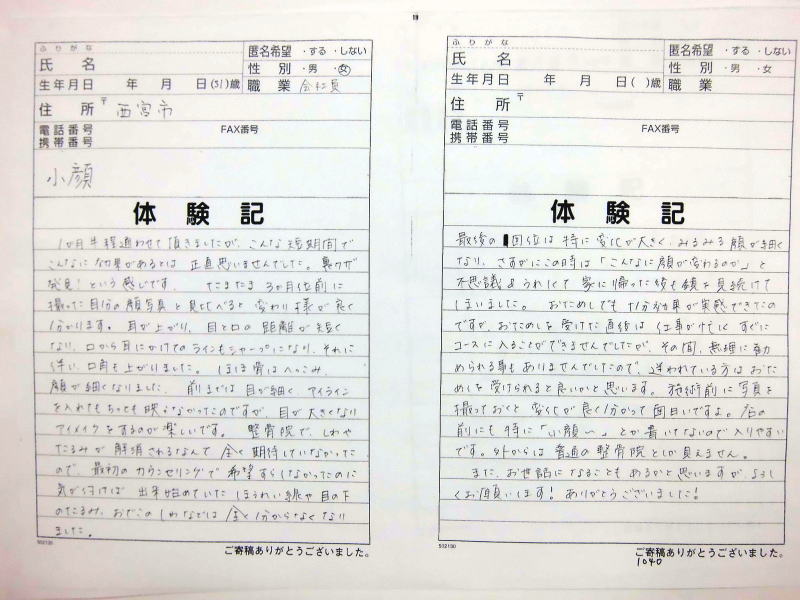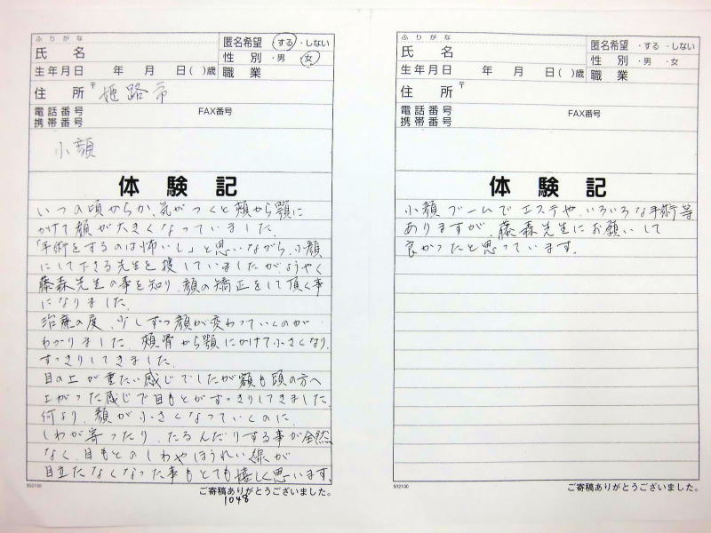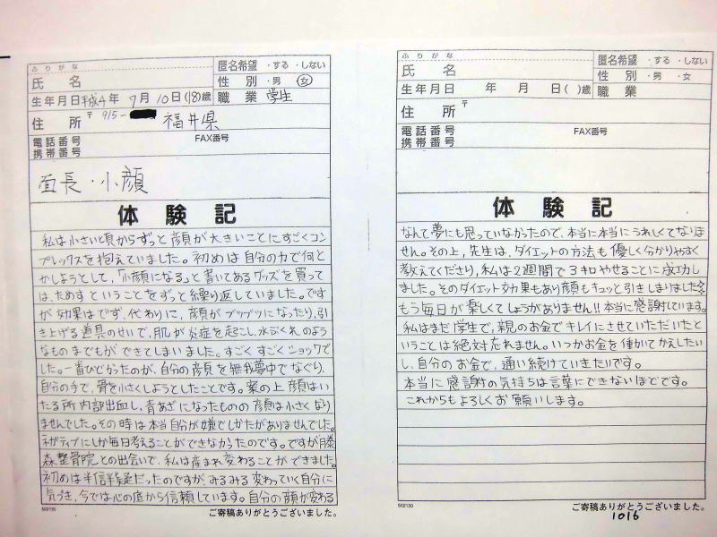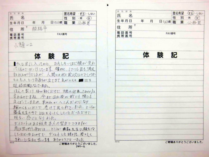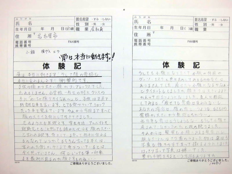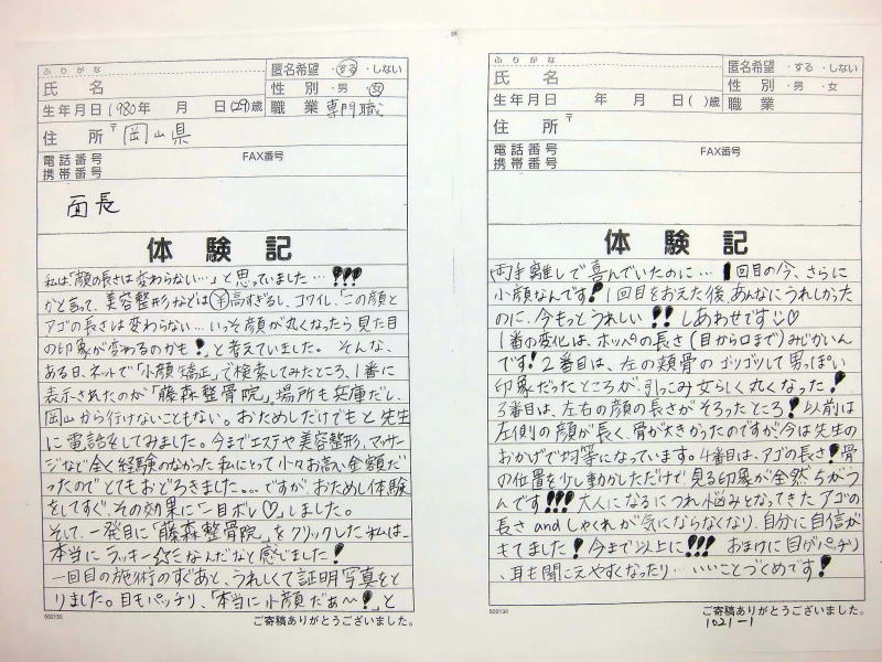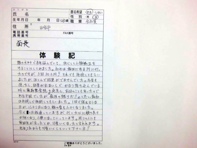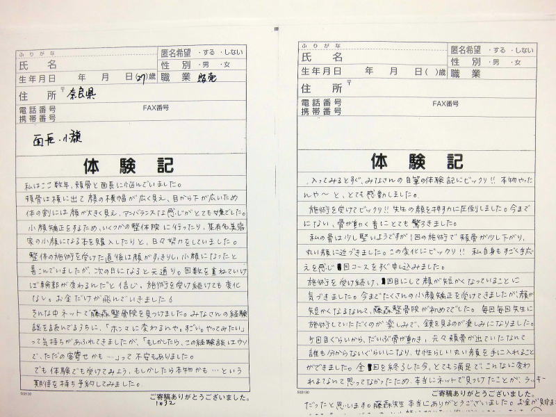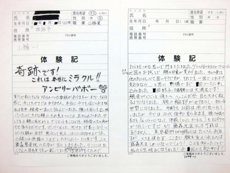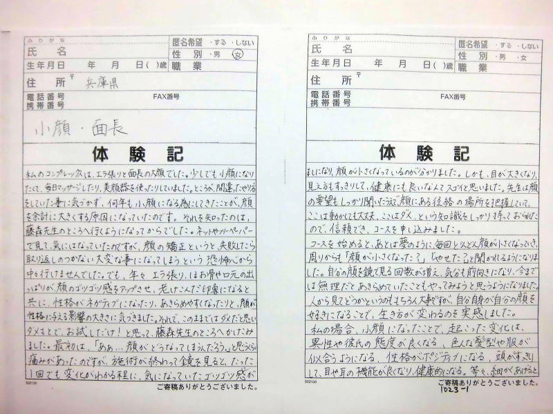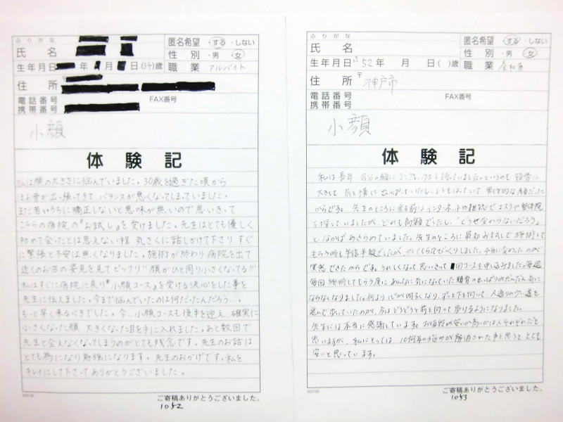 小顔その他に不安な方は体験談集(個人の感想)で、自筆体験記院内で開示