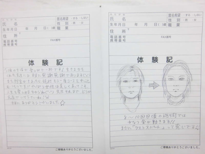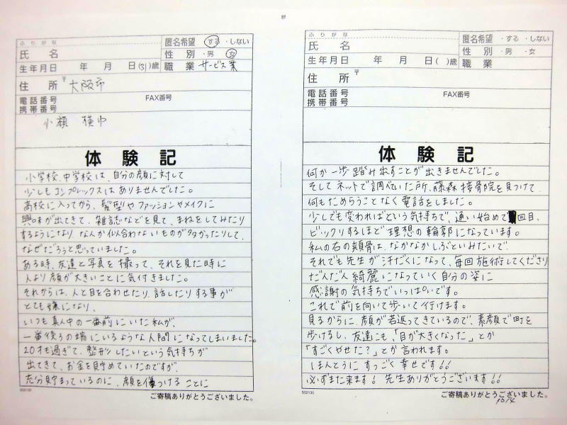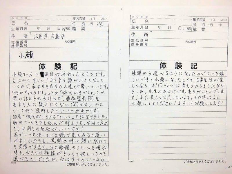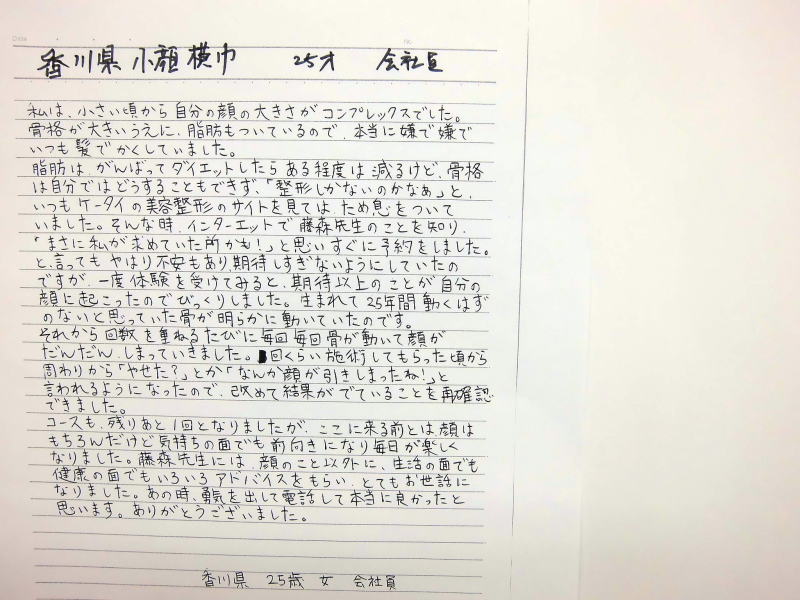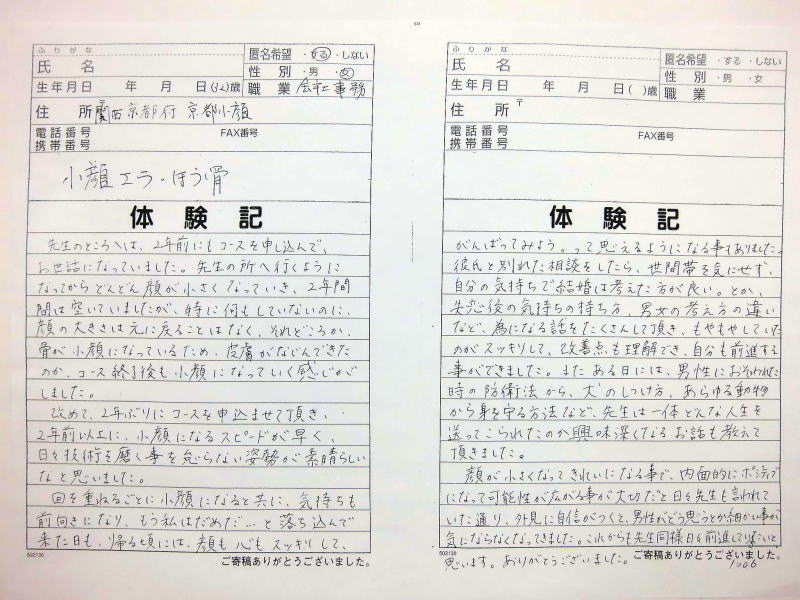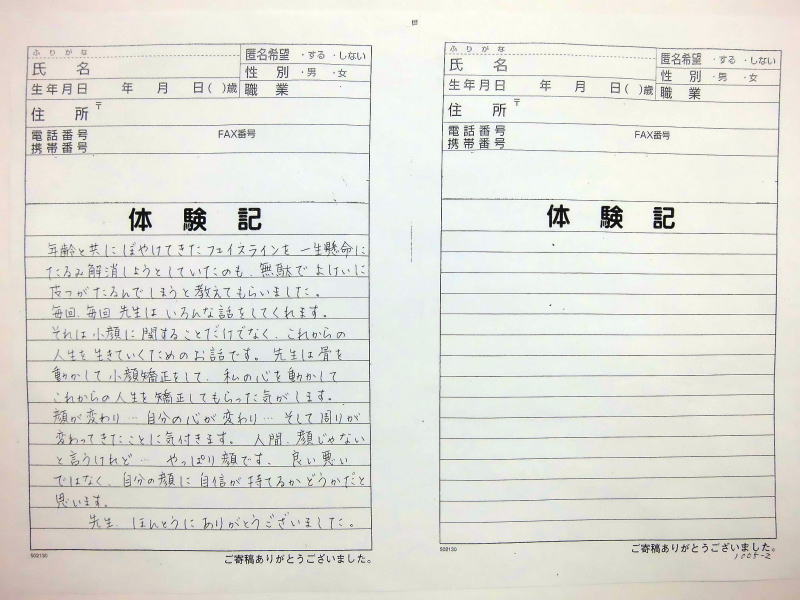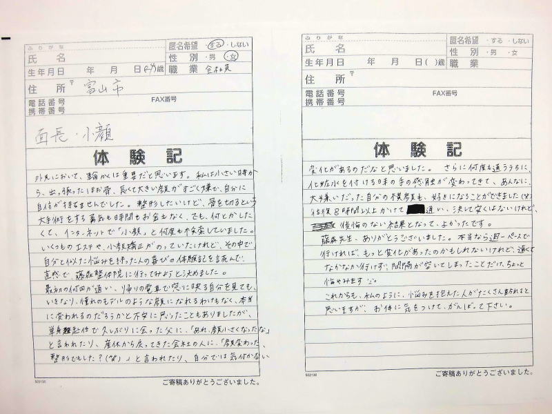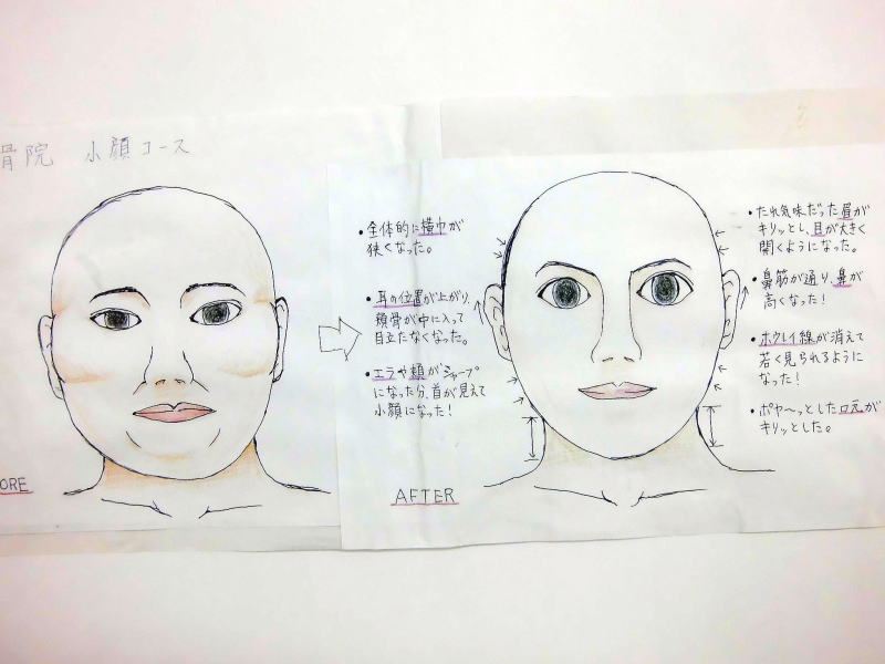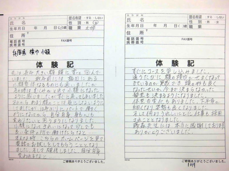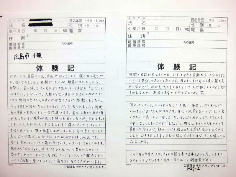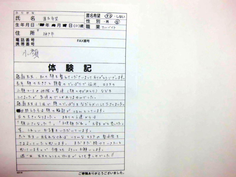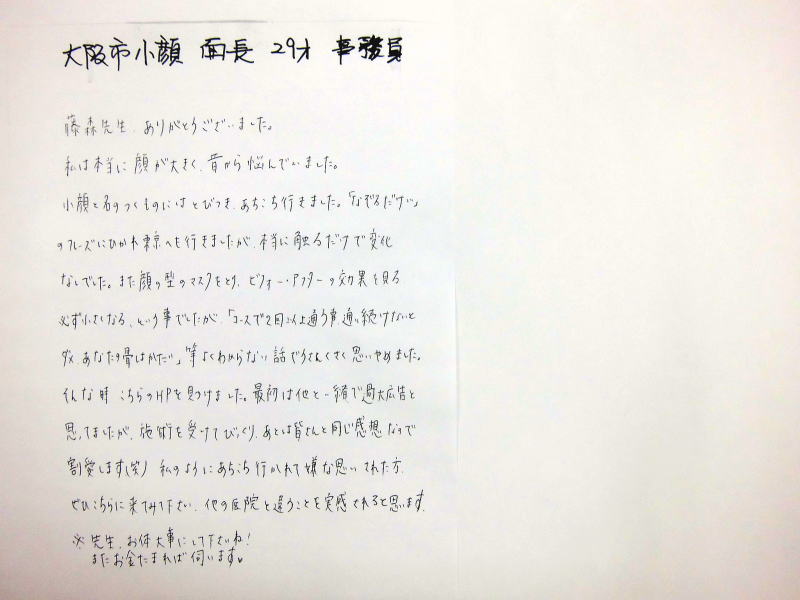 小顔その他に不安な方は体験談集(個人の感想)で、自筆体験記院内で開示