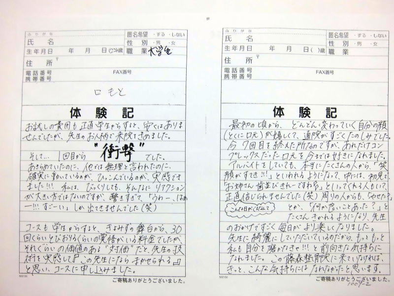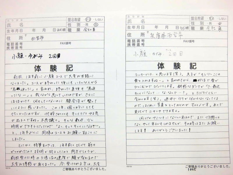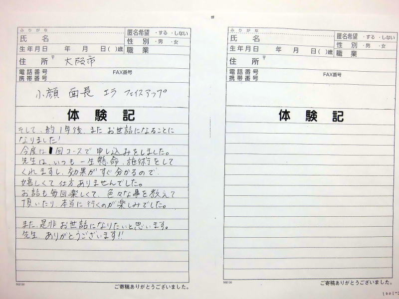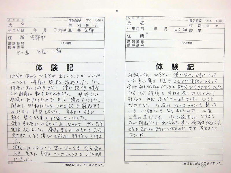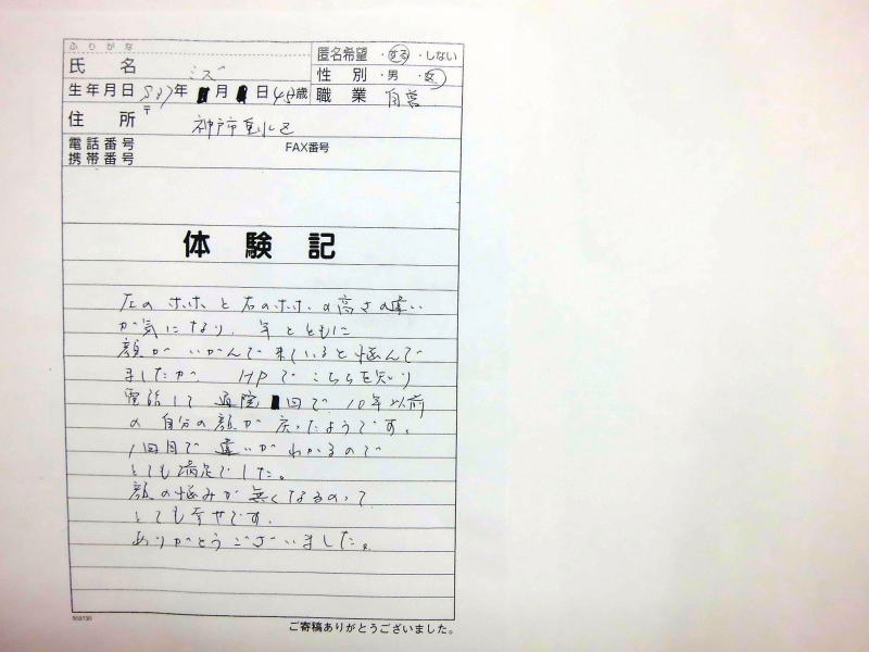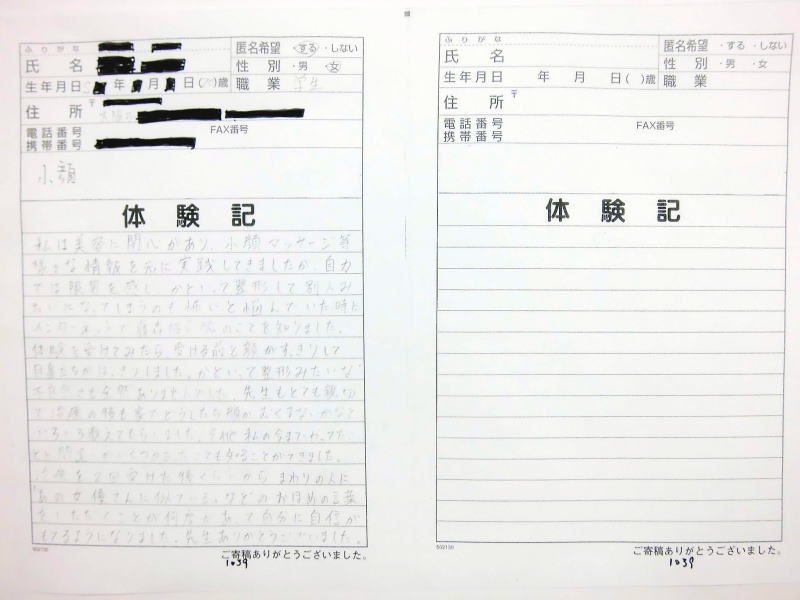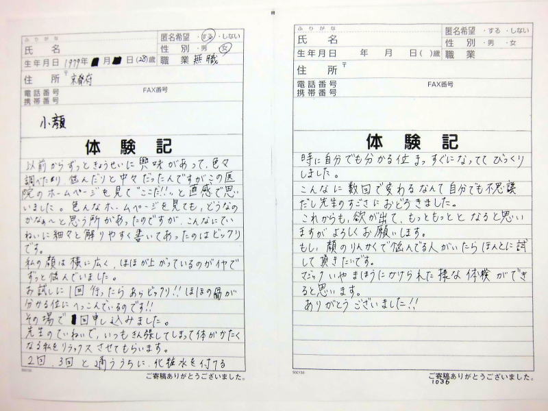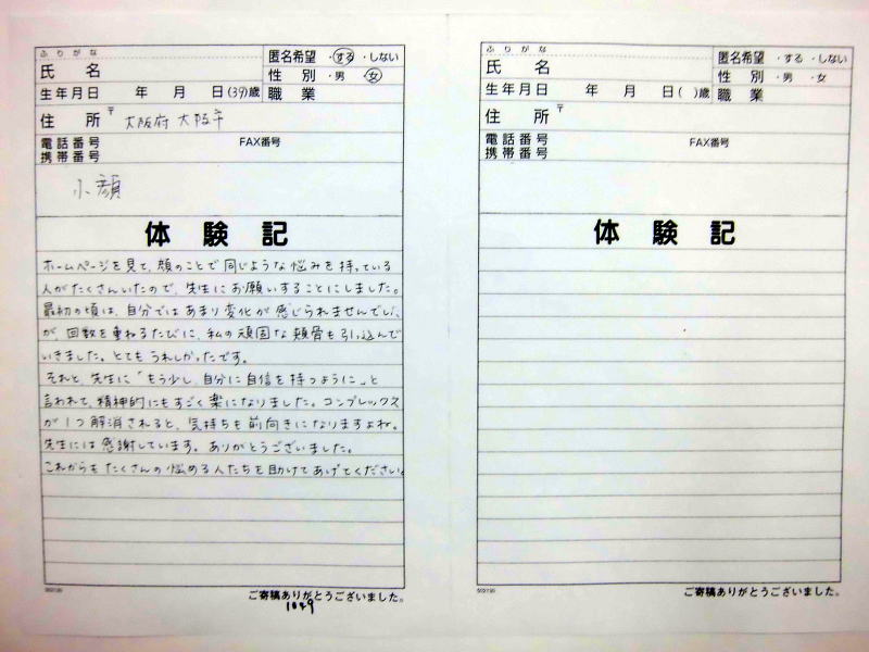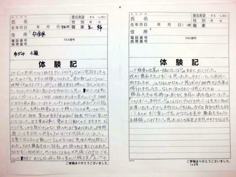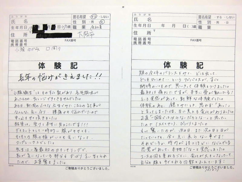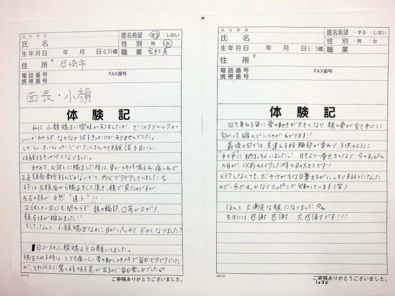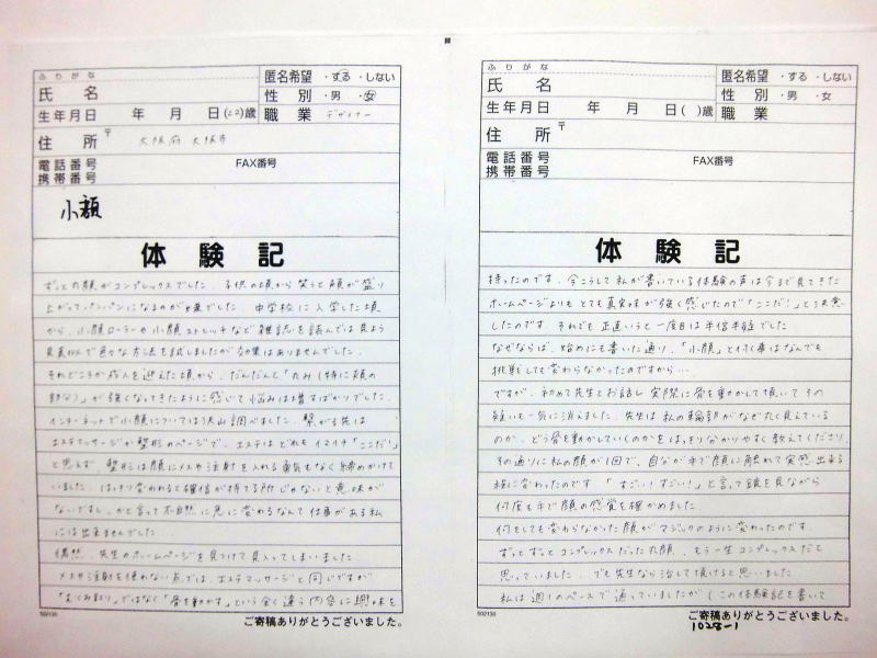 小顔その他に不安な方は体験談集(個人の感想)で、自筆体験記院内で開示