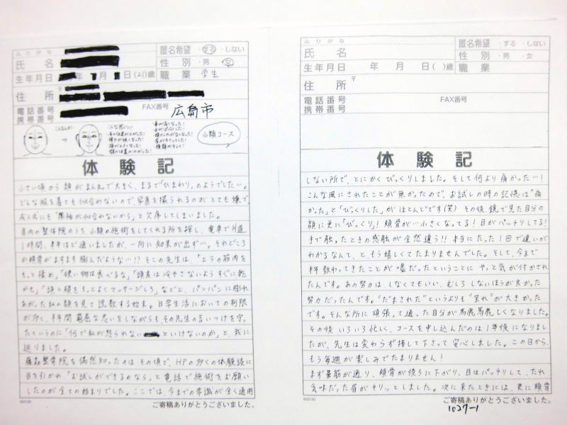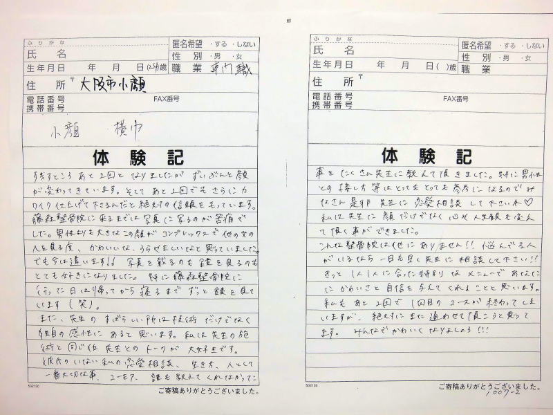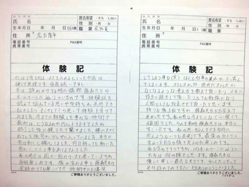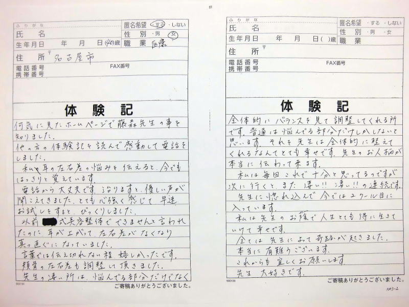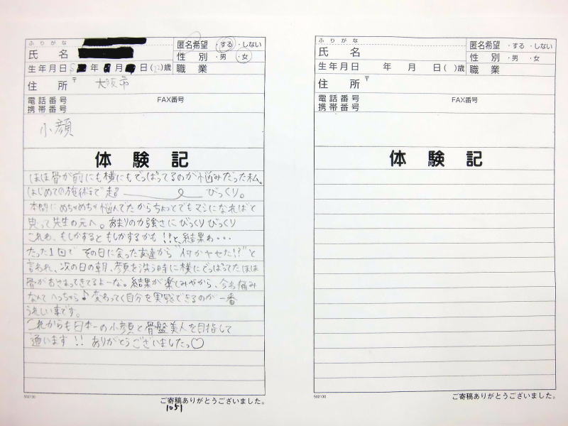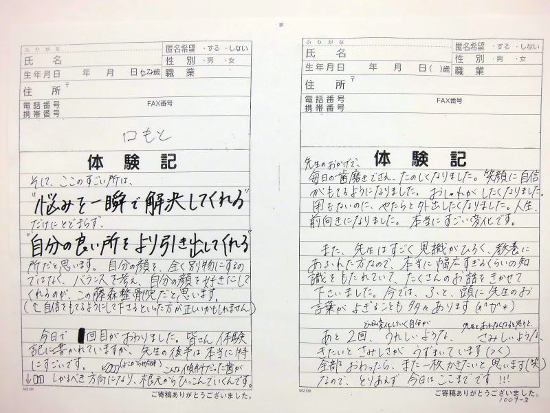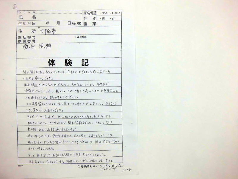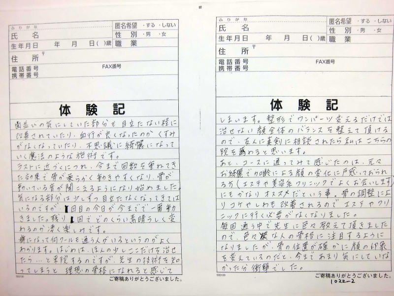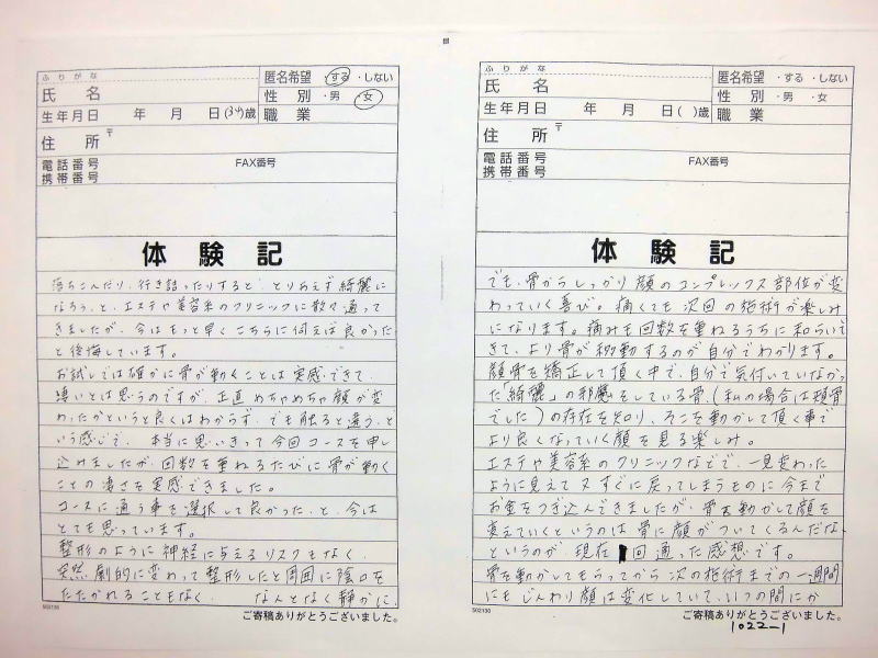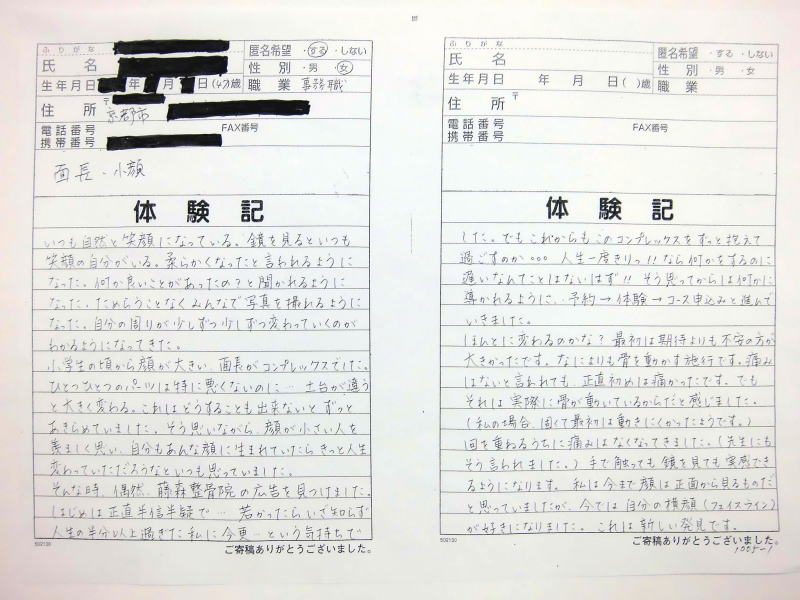 自筆体験記は院内で提示、 顔の矯正は、 バージョンアップ しており1回でも顔骨