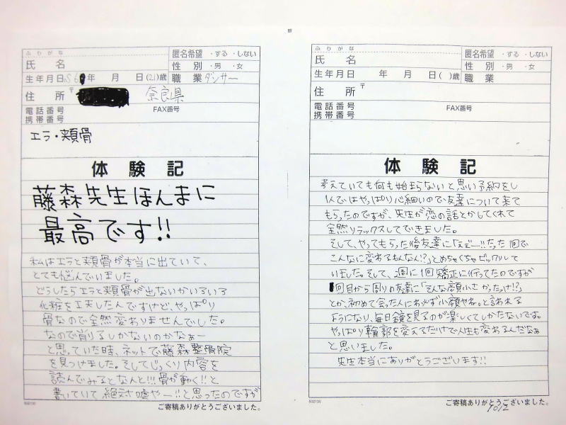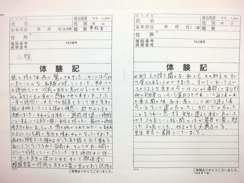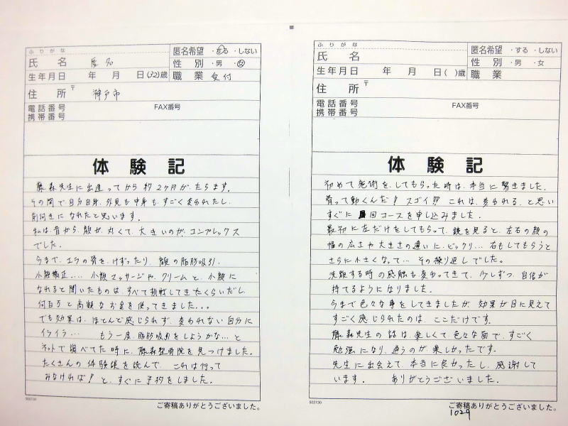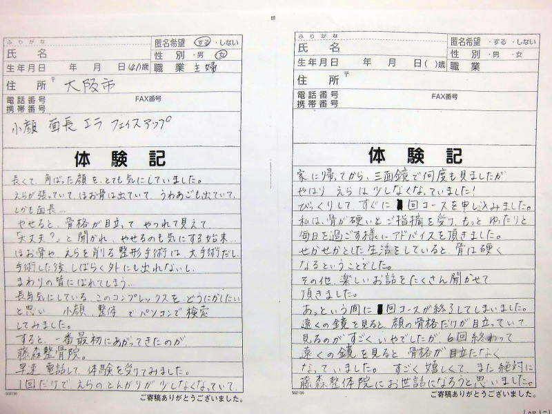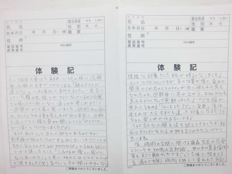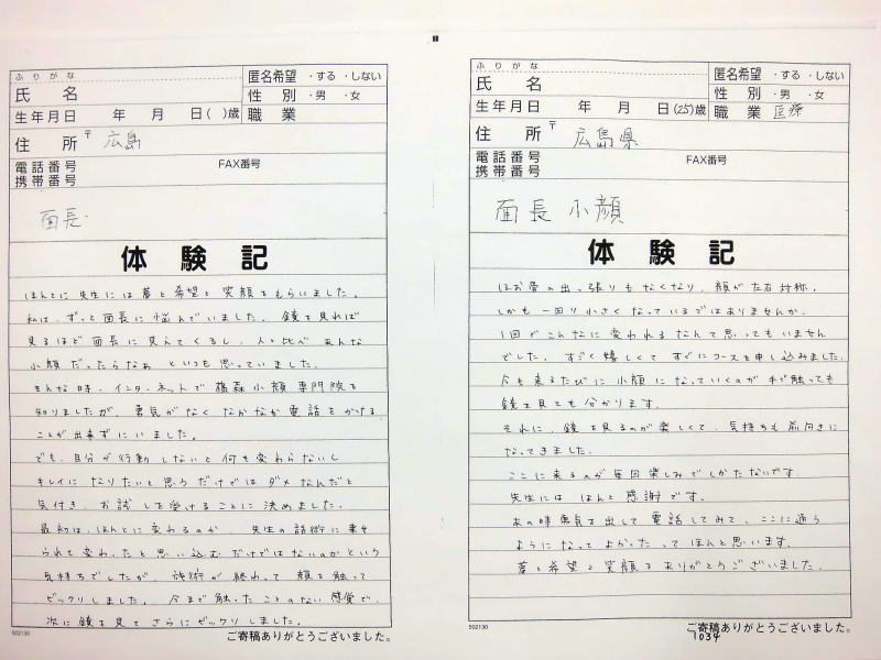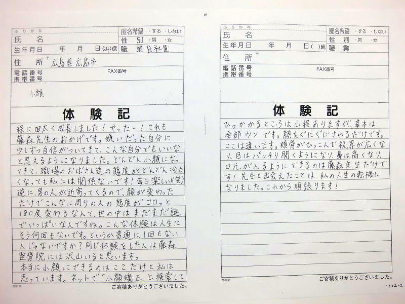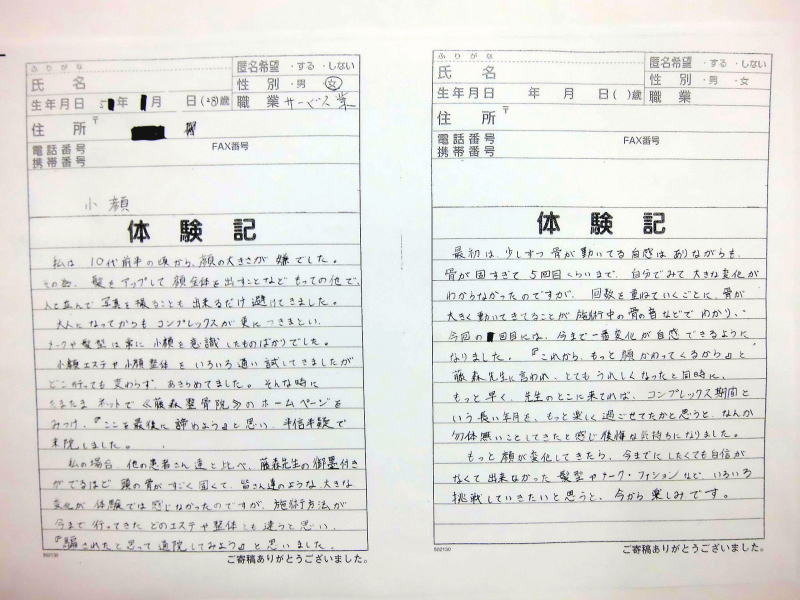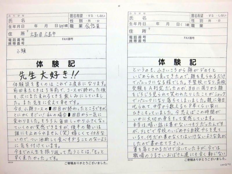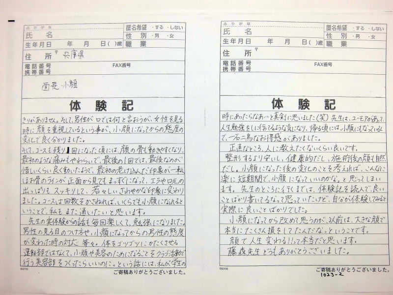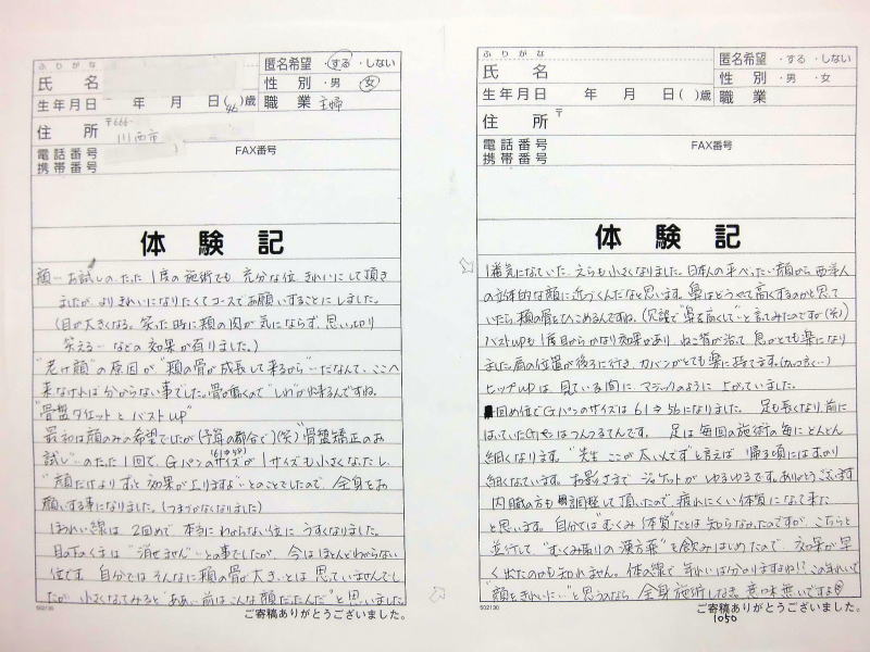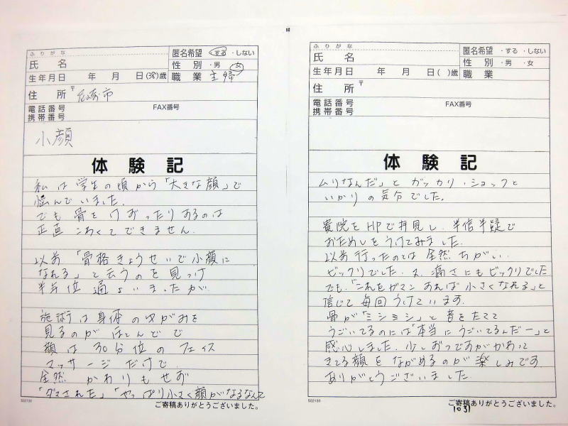 小顔その他に不安な方は体験談集(個人の感想)で、自筆体験記院内で開示
