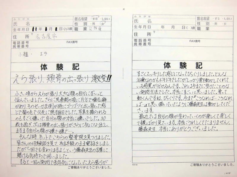 自筆体験記は院内で提示、 顔の矯正は、 バージョンアップ しており1回でも顔骨
